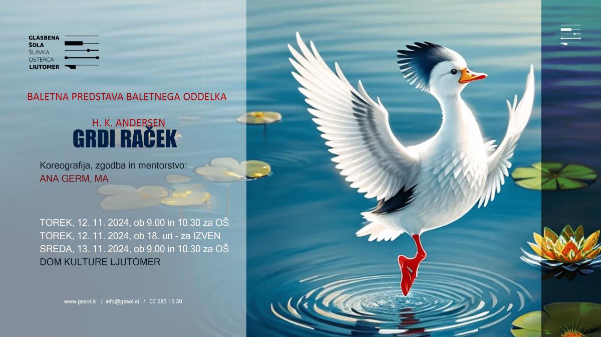 Vabljeni na baletno predstavo z naslovom Grdi raček, ki ga organizira Glasbena šola Slavka Osterca Ljutomer, ki se bo odvijala v torek, 12. 11. 2024 ob 18. uri v Domu kulture Ljutomer.