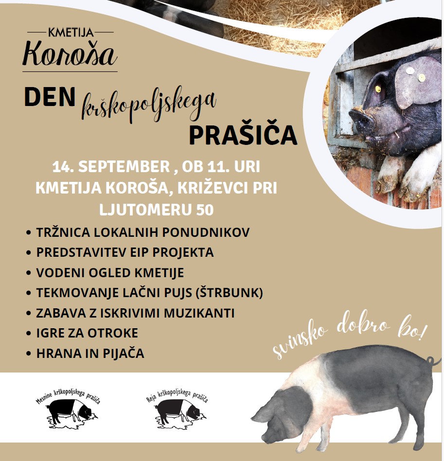 Vljudno vabljeni na ˝den kraškopoljskega prašiča˝, ki bo 14.9. 2024, ob 11. uri, na kmetiji Koroša v Križevcih pri Ljutomeru 50. Deležni boste tržnice lokalnih ponudnikov, imeli bodo voden ogled kmetije, tekmovanje, igre za otroke, hrano ter pijačo. Prav tako bo poskrbljeno za zabavo z Iskrivimi muzikanti.
