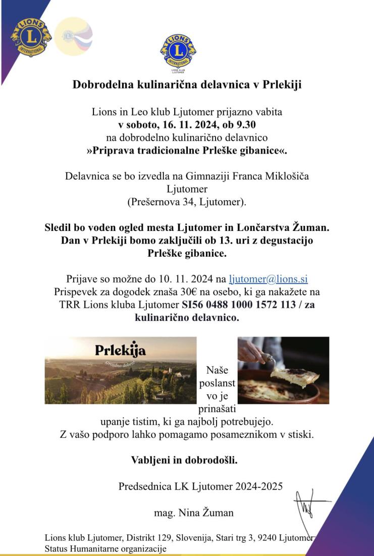 Vabljeni na dobrodelno kulinarično delavnico v Prlekiji, ki jo organizirata Lions in Leo klub Ljutomer. Več podrobnosti v priloženem letaku.