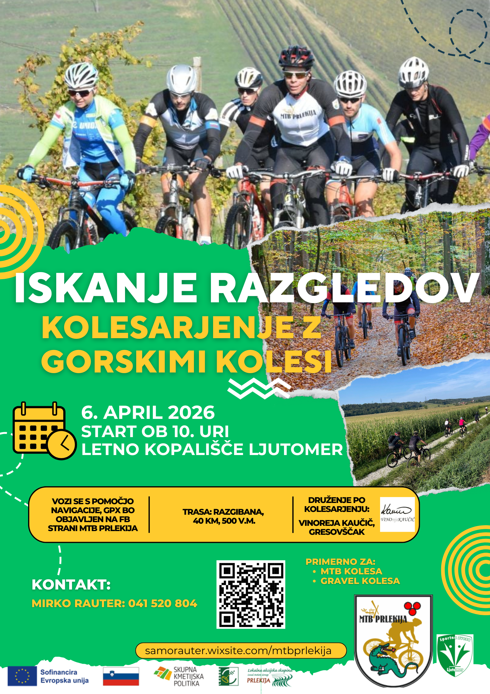 Na velikonočni ponedeljek, 6. aprila 2026, MTB Prlekija organizira ISKANJE RAZGLEDOV, rekreativno kolesarjenje z gorskimi in gravel kolesi. Letos predlagajo razdaljo približno 40 km in 500 vm.