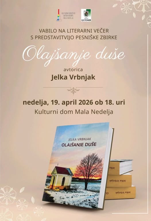 Vabljeni na literarni večer Kulturnega društva Mala Nedelja z Jelko Vrbnjak in njeno pesniško zbirko Olajšanje duše.