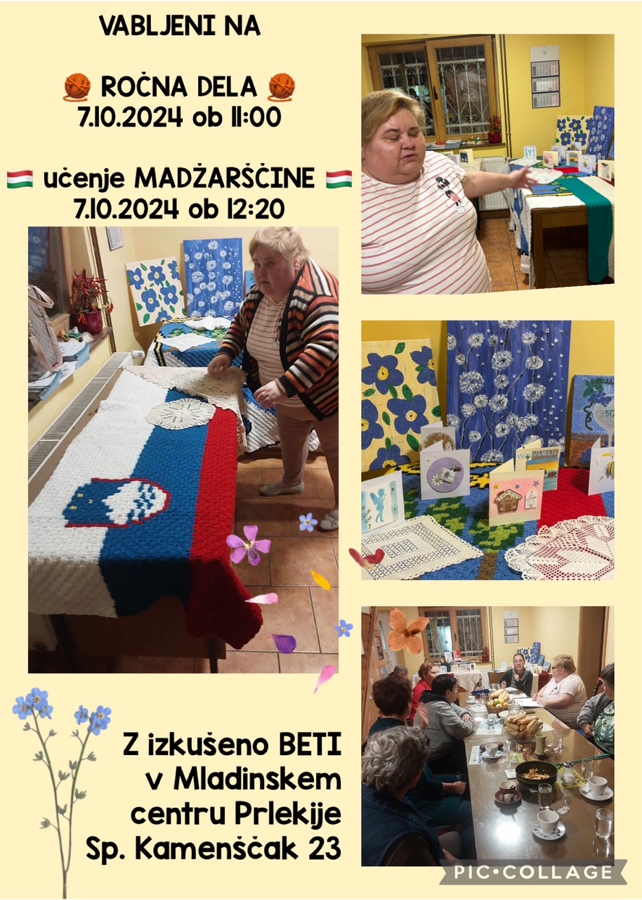 Vljudno vabljeni na učenje MADŽARŠČINE in ROČNA DELA z izkušeno Beti, ki bo v ponedeljek, 7. oktobra 2024, s pričetkom ob 11. uri, v Mladinskem centru Prlekije, Sp. Kamenščak 23.