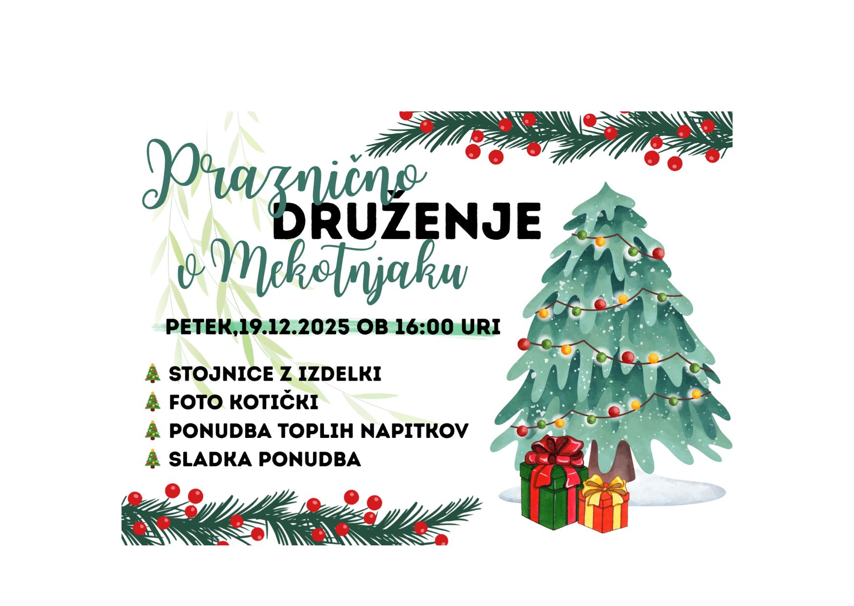 Vabljeni na praznično druženje v Mekotnjaku, ki bo v petek, 19. 12., ob 16. uri. Čakajo vas stojnice z izdelki, foto kotiček ter ponudba toplih napitkov.