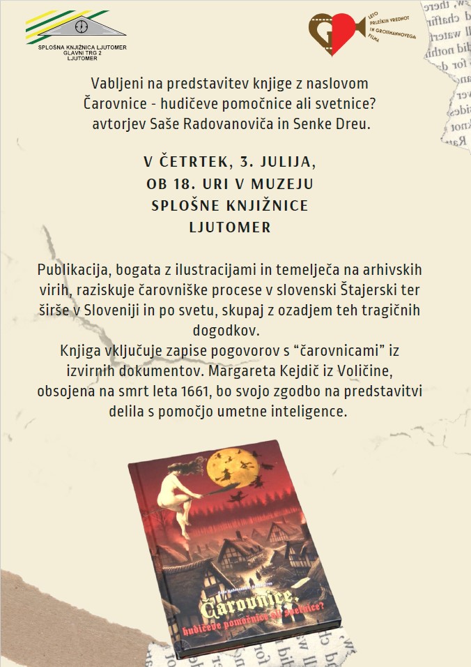 Knjiga vključuje zapise pogovorov s “čarovnicami” iz izvirnih dokumentov. Margareta Kejdič iz Voličine, obsojena na smrt leta 1661, bo svojo zgodbo na predstavitvi delila s pomočjo umetne inteligence.