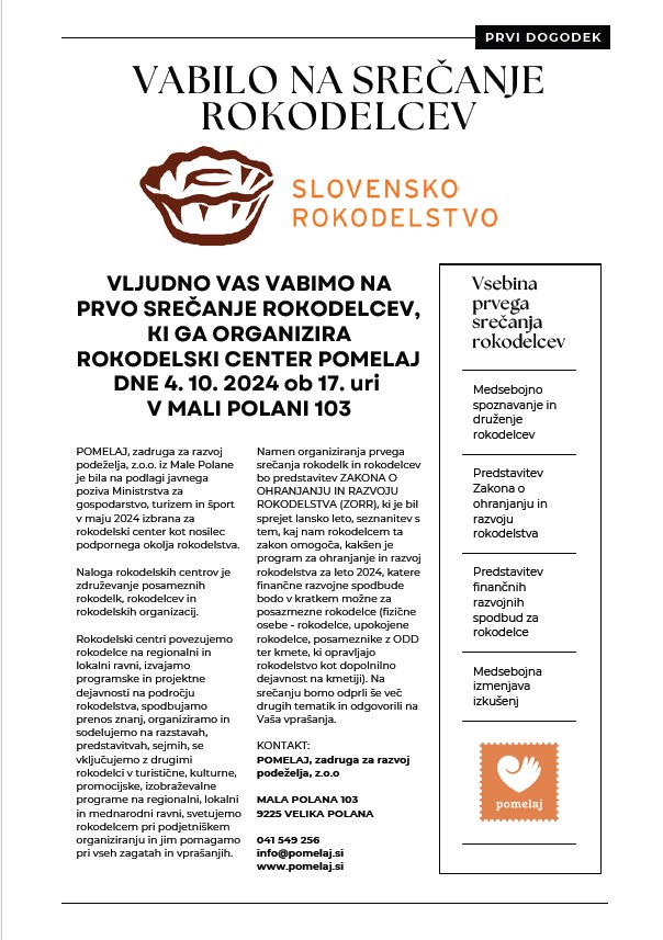 Vljudno vabljeni vsi lokalni rokodelci na prvo srečanje rokodelcev, ki ga organizira ROKODELSKI CENTER POMELAJ, dne 4.10.2024, ob 17. uri, v Mali Polani 103.